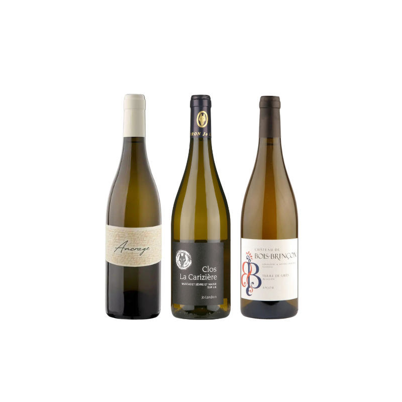 Coffret Escapade dans la Loire : Touraine expressive, Muscadet vif et Anjou minéral. Trois blancs de Loire pour une escapade fraîche et élégante.
